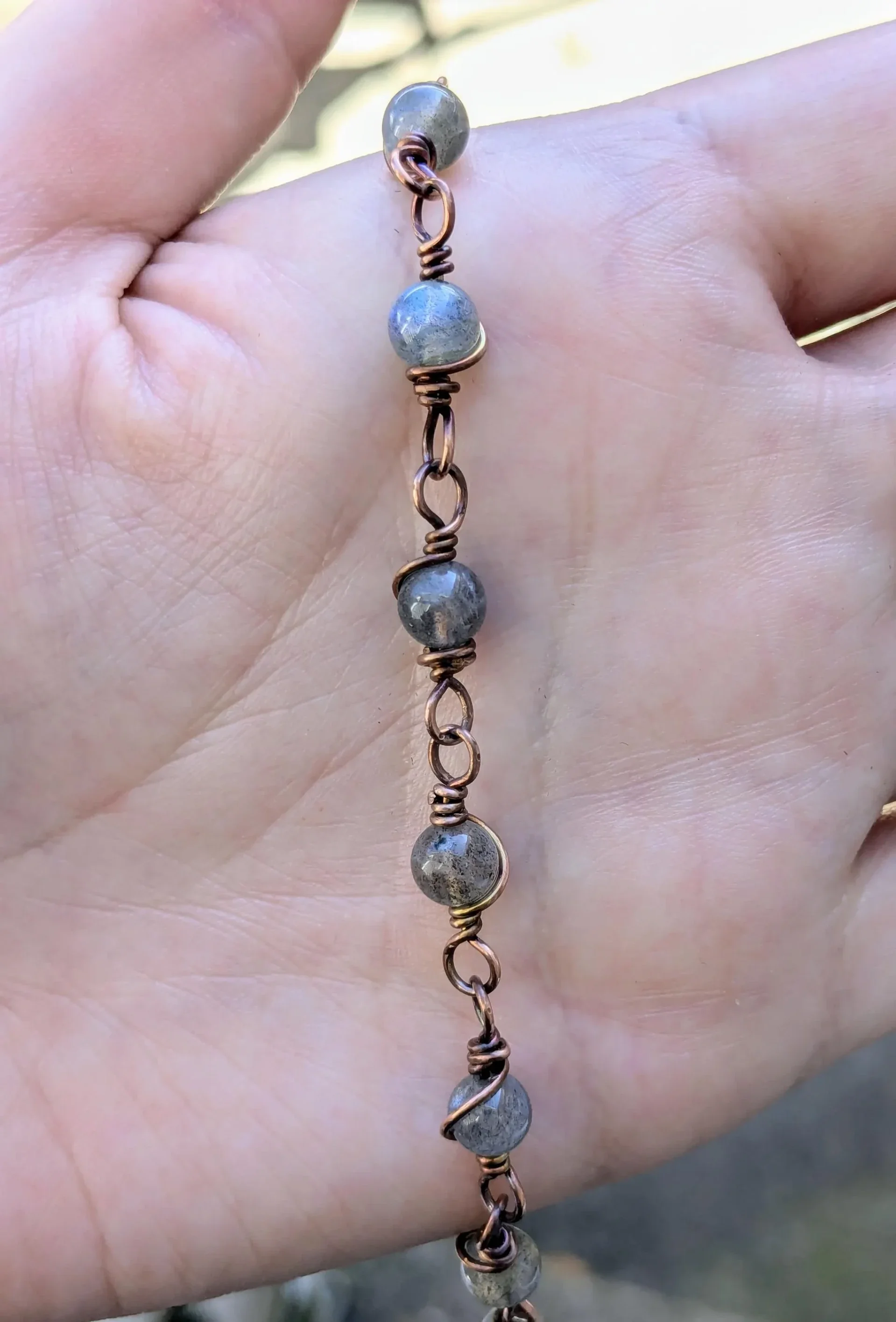 Beautiful flashy labradorite gemstone bracelet that's wire wrapped in 99.9% copper wire. Large clasp that doubles as a focal area and accented with a swarvoski bicone crystal bead. Makes a great anniversary gift for her.