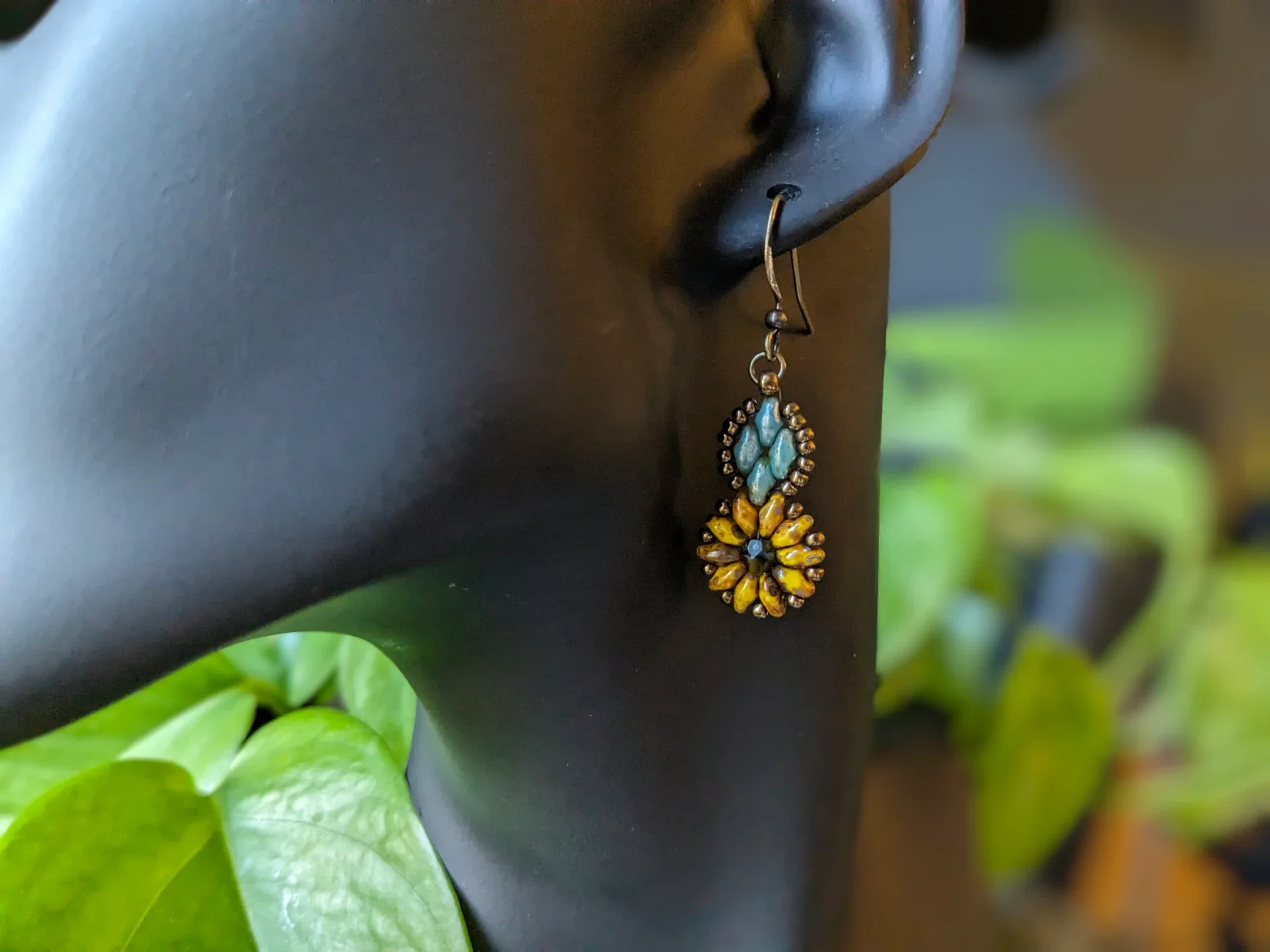 Handmade beaded sunflower earrings in yellow and blue with a Picasso finish. Gorgeous simple, boho themed fall dangle earrings.