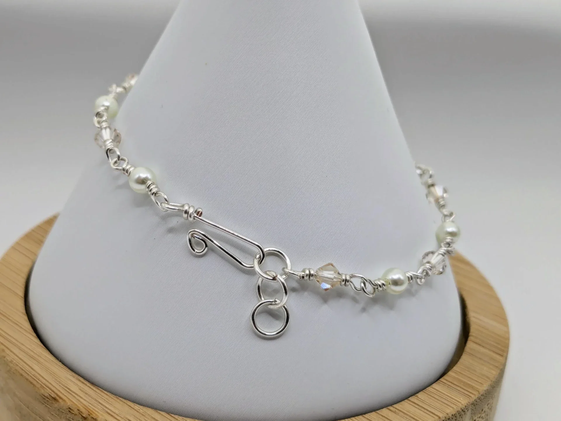 Wire wrapped cream pearl and crystal bracelet. Handmade with Potomac glass faux pearls and preciosa glass crystal bicones. Beautiful, lightweight, and dainty. Great for stacking or layering. Elegant enough for bridal jewelry.